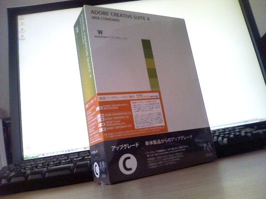 今月28日に発売される「Adobe CS5」シリーズ。今回自分はCS2からのアップグレードをする為、CS4 Web Standard UPGを購入しました。新規購入だと約23万円。通常のアップグレード版(自分の場合は単品から)だと約19万円くらいしますが、今回無償アップグレード対象品として約7万円で購入する事が出来ました。それでも7万円。立派な金額です。(単行本/島耕作:140冊くらい買えます)そんな新品CS4パッケージですが、無償でCS5アップグレード版へ差し替わる為に実際に使用する事はありません。と言う訳で、初めまして、さようなら。