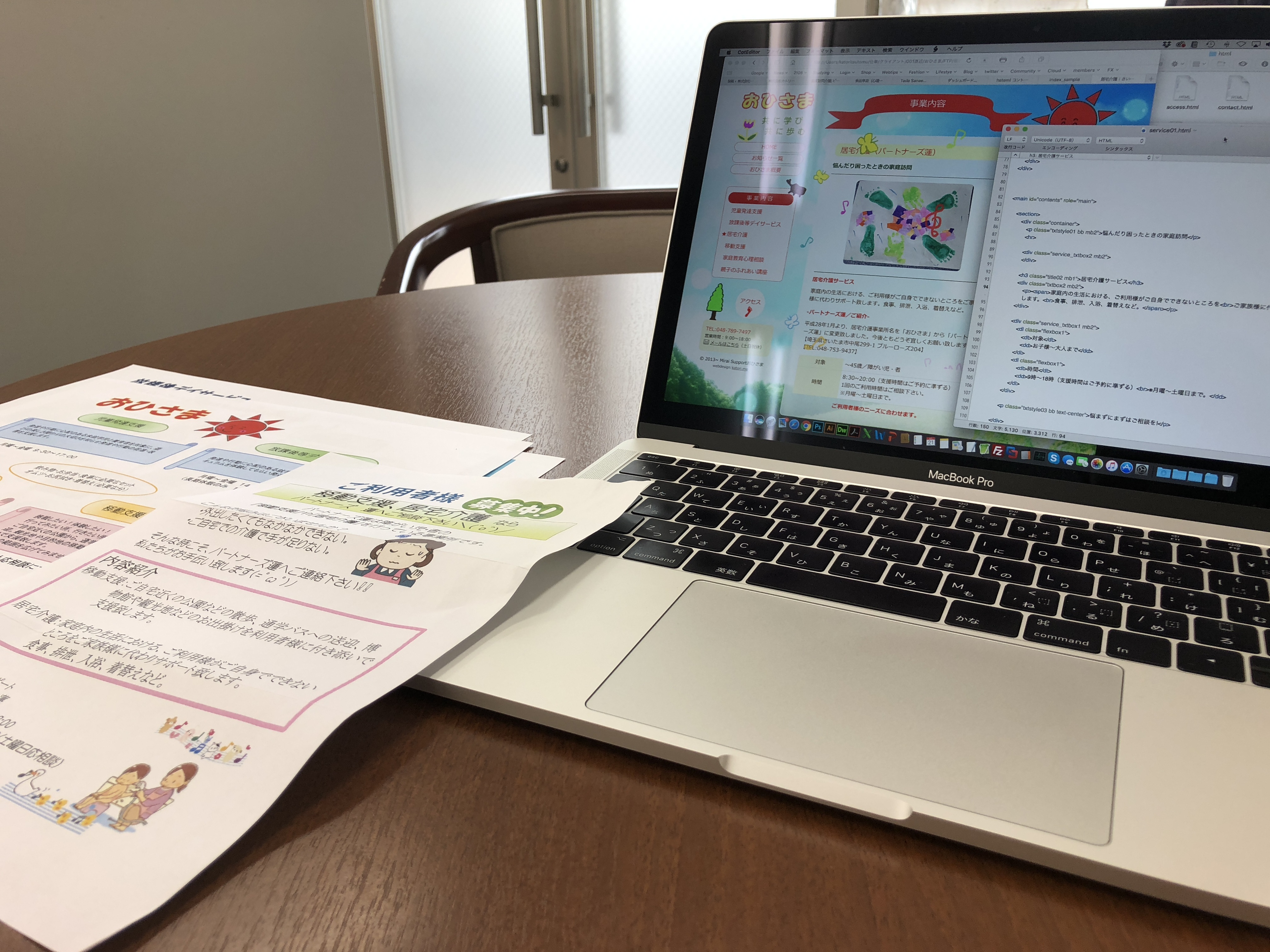 パソコンのリテラシーのある方とそうで無い方の場合、やはり後者では紙ベースでの方が依頼しやすい。と行った事は当たり前の事ですので、先方がご用意された「こんな風にしたい」と書かれた手書きメモを、私が目の前で修正しその場で確認しながら進めさせて頂きました。弊社での更新にはCMS(ワードプレス等)では無く、DW(ドリームウィーバー)を使用しております。